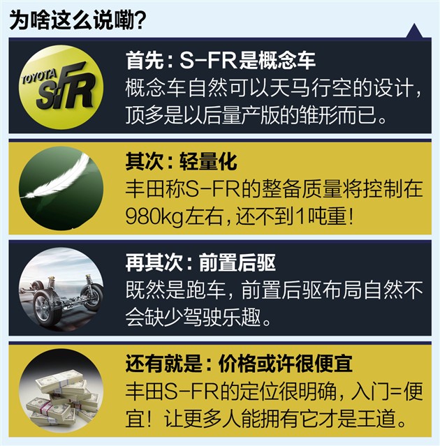 显然,丰田S-FR被首次关注的很大部分原因来自它颇具争议的外形设计,但是当我们看到一款自重1吨以下、前置后驱的入门级跑车雏形出现时,似乎还处于概念车阶段的S-FR长什么样已经并不重要了。从目前丰田官方给出的参数信息看,这款S-FR概念跑车与全新大发Coper Cero、本田S660等一批小型化入门跑车一样,再一次掀起了日系平民跑车文化的高潮。别忘了,在他们之前,马自达已经推出了备受关注的全新MX-5。在期待丰田S-FR量产版早日推出的同时,也希望其量产车型的设计减少一些争议,多一些大众化的元素。