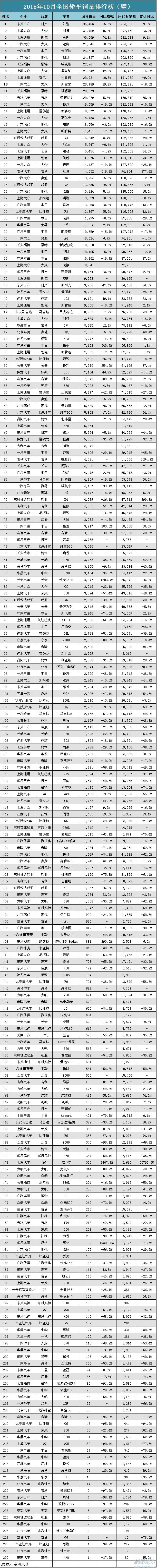 虽然轿车市场10月销量同比微跌,但在新政推动下,1.6升以下小排量车因购置税减半,销量反而攀升。自主品牌轿车未能进入前十,最高的吉利EC7以20,079辆位居第12位,逸动、吉利远景和比亚迪F3也都超过万辆大关。