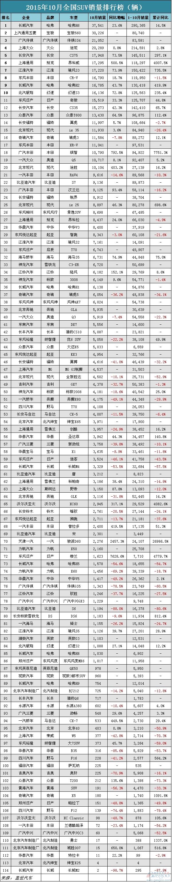 SUV本次总共列出114个车型。哈弗H6、宝骏560和传祺GS4为自主品牌赢下前三席位,之后依次是途观、CS75、昂科威、瑞风S3、CR-V、哈弗H2和幻速S3进入十强,自主总共占得7成位置。