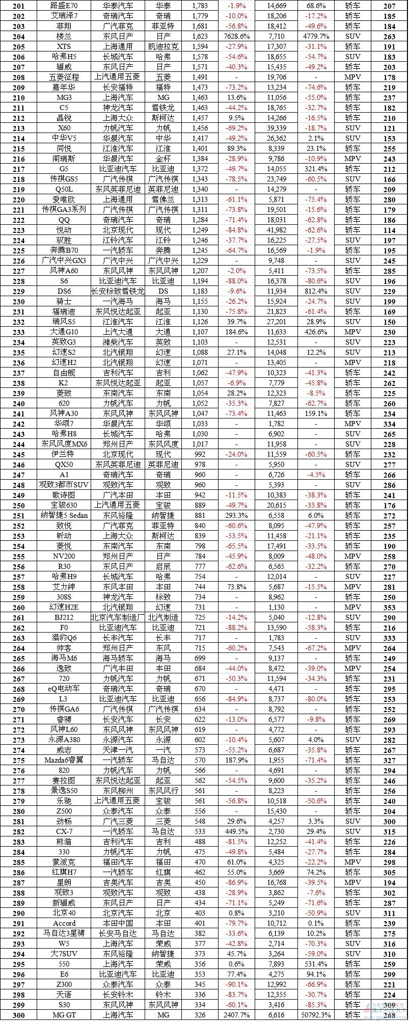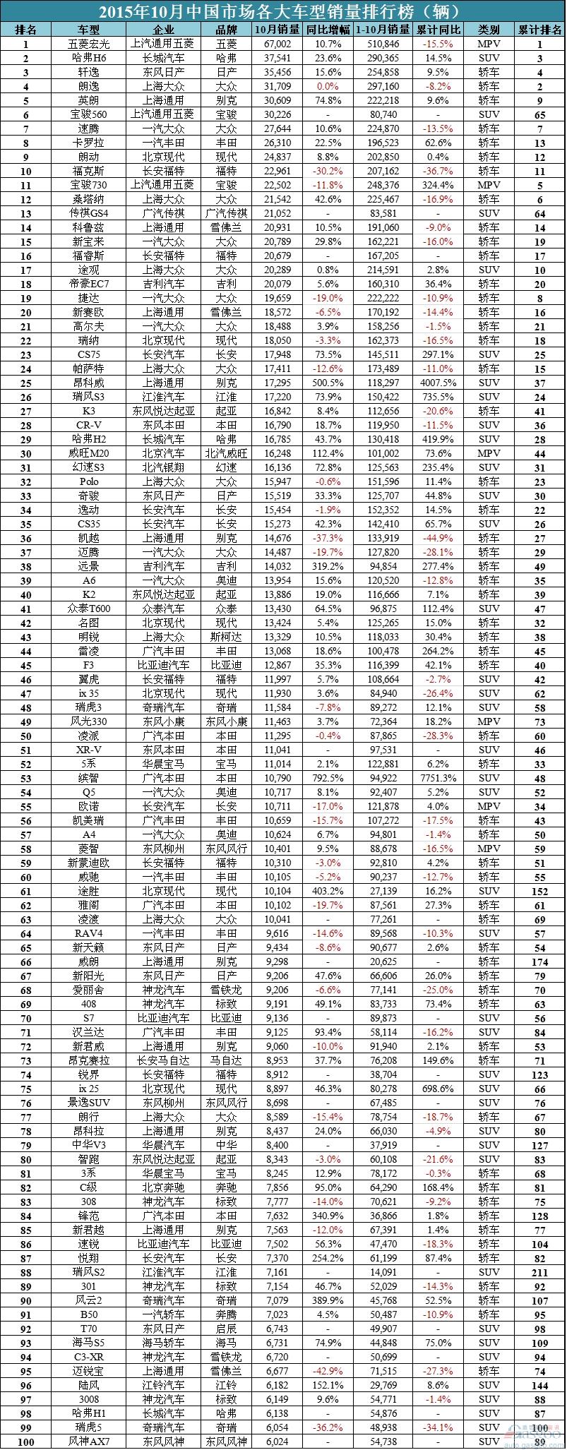 本次榜单对英朗、福克斯等车型按照nameplate车名进行了新老款合并,最终车型总数为388款。五菱宏光、哈弗H6和轩逸分别是MPV、SUV和轿车销量冠军,也是总榜单的前三甲,10月批发销量分别达到67,002辆、37,541辆和35,456辆。宝骏560上市不久便稳居SUV三强,10月以30,226辆摘银;广汽传祺GS4则达到21,052辆,位居第三,力压大众途观和本田CR-V。因此自主品牌囊括了SUV市场10月份前三名。