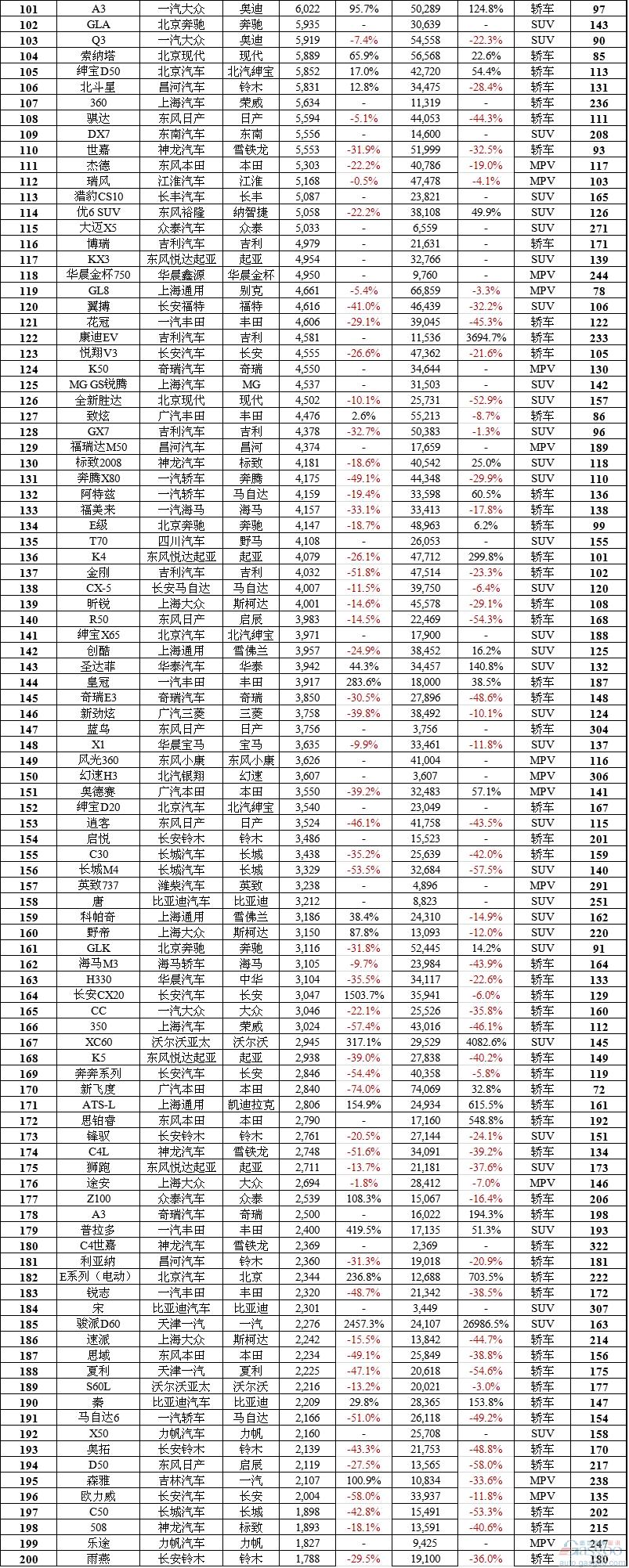 轿车排行榜中,上个月共列出230个车型。除了轩逸年内第二次夺冠之外,朗逸和英朗分别以31,709辆和30,609辆位居第二和第三,之后依次是速腾、卡罗拉、朗动、福克斯、桑塔纳、科鲁兹、新宝来进入前十。在十强中,增速最高者为英朗、桑塔纳、宝来,分别达到74.8%、42.6%和29.8%。