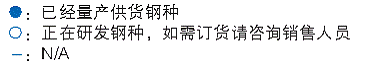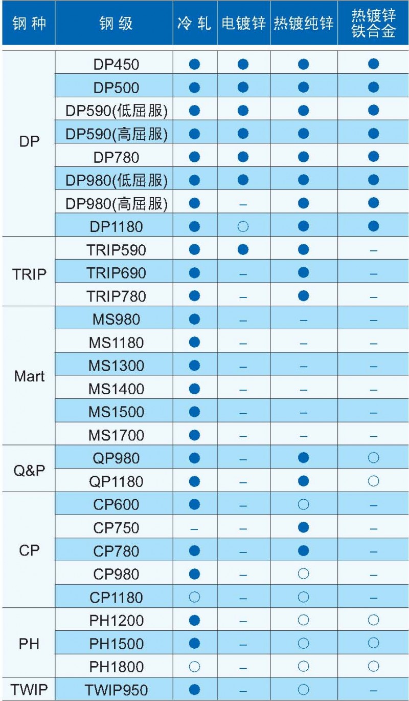 注:表中宝钢钢级和部分其他标准中相近钢级(抗拉强度相差不超过20MPa)虽命名不同但属于同一钢级,可供情况参照表中宝钢钢级,如:DP590和DP600为同一钢级,参照DP590;TIRP780和TIRP800为同一钢级,参照DP780。