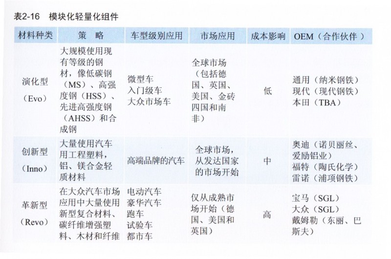 考虑成本和减重效果OEM针对不同级别产品和不同市场将采取至少三个模块化轻量化组件 – 演化型(Evo)、创新型(Inno)和革新型(Revo)– 它们是通过原材料成分定义的,并源自二氧化碳减排目标。预期这些组件将成为差异化的竞争车型,以作为品牌创新从而促进销量。如下表2所示,微型车及入门级车市场主要考虑扩大高强度钢和超高强度钢的适用范围,面向发达国家市场的高端产品使用铝、镁等合金材料替代钢材,美德等成熟市场豪华车及电动车,跑车等成本压力较小的顶级细分车型中大量使用碳纤维等复合材料。