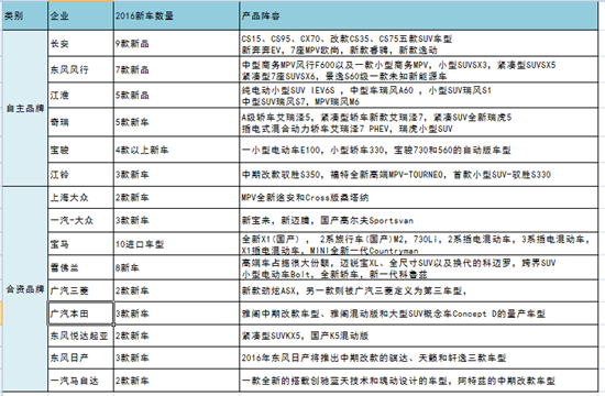 上述15家企业中,共有自主品牌6家,跨国品牌9家,由上述图片可以看出,15家车企在2016年均有新品推出,最多9款,最少的2款。