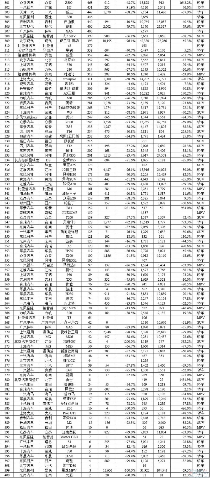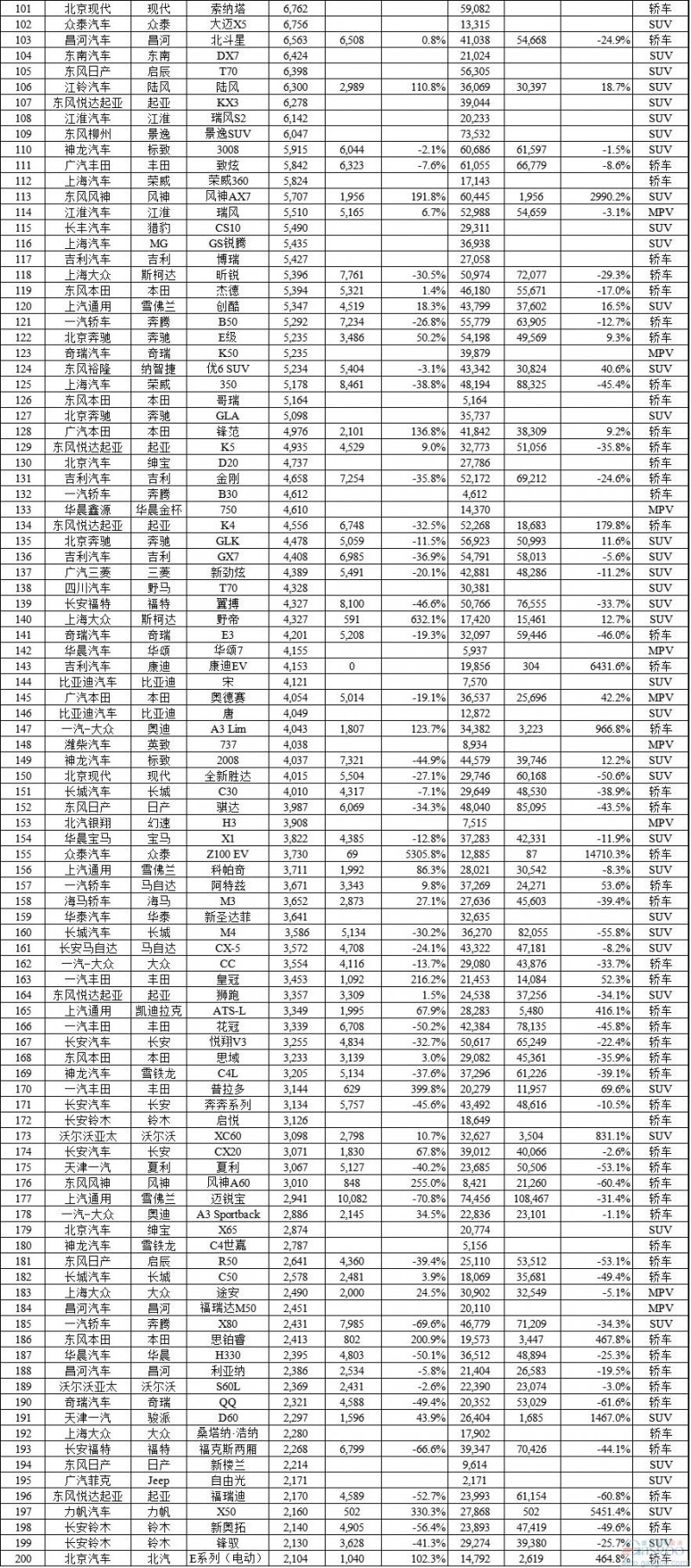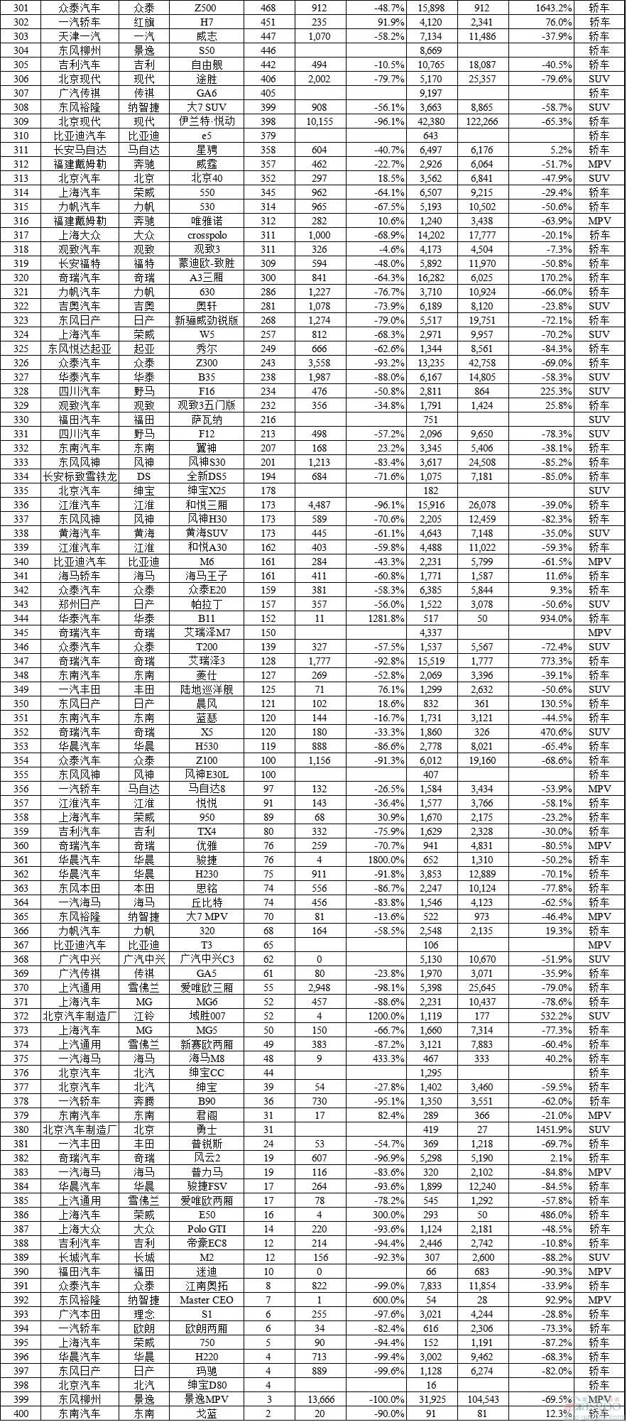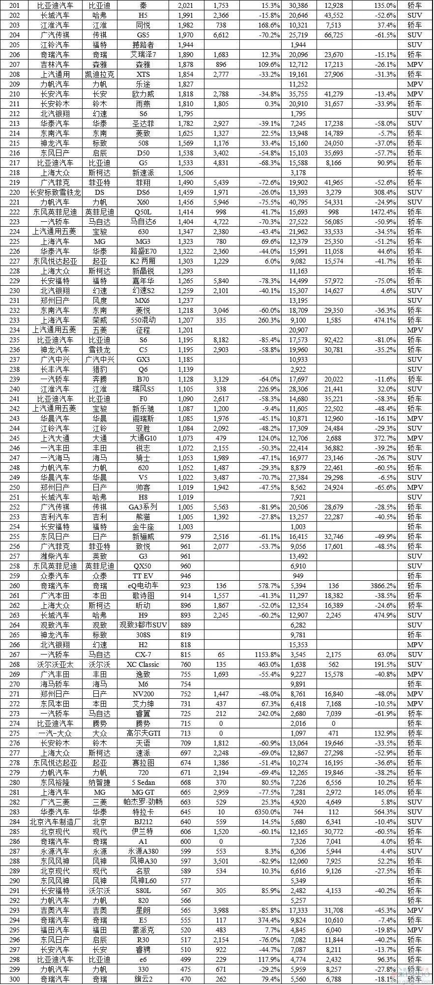 当月销量过万辆的MPV车型为6款,除了别克GL8和杰德之外前十强均为自主品牌车型。增幅最高为风行菱智,高达132.1%,其次是北汽威旺M20(91.9%)。五菱宏光由于老款车型的退出,销量同比略降2.7%,逐渐进入平稳期的宝骏730和长安欧诺,分别同比下滑16.9%和20.8%。