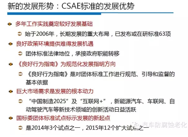 会议首先由中国汽车工程学会主管团体标准的张文杰老师作《中国汽车工程学会标准化工作情况介绍》报告。报告中对中国汽车工程学会标准化工作情况作了简单的回顾和深入的剖析。张老师指出,近年国家颁布的一系列政府文件表明,社会组织在未来国家发展和社会治理中必将扮演更加重要的角色,承担更加重要的责任。而团体标准更是被列为中国科协所属学会有序承接政府转移职能扩大试点的优先内容之一。所以本次单项标准申报会议的举办,恰逢其时!