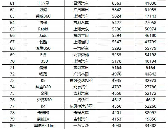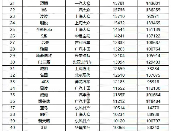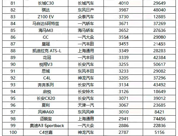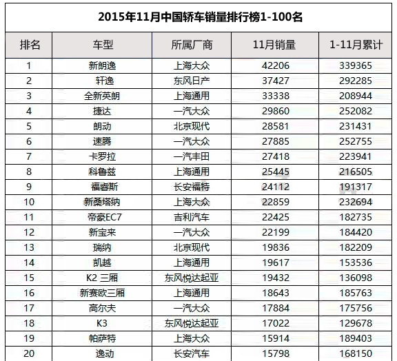 2015年11月中国轿车销量排行榜1-100名重磅出炉