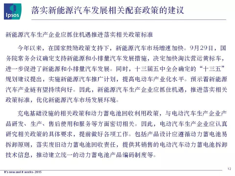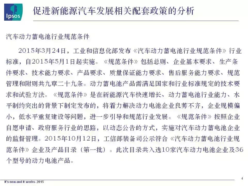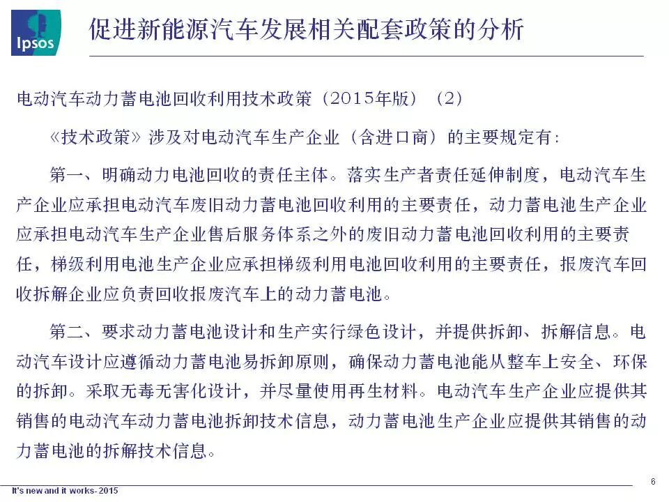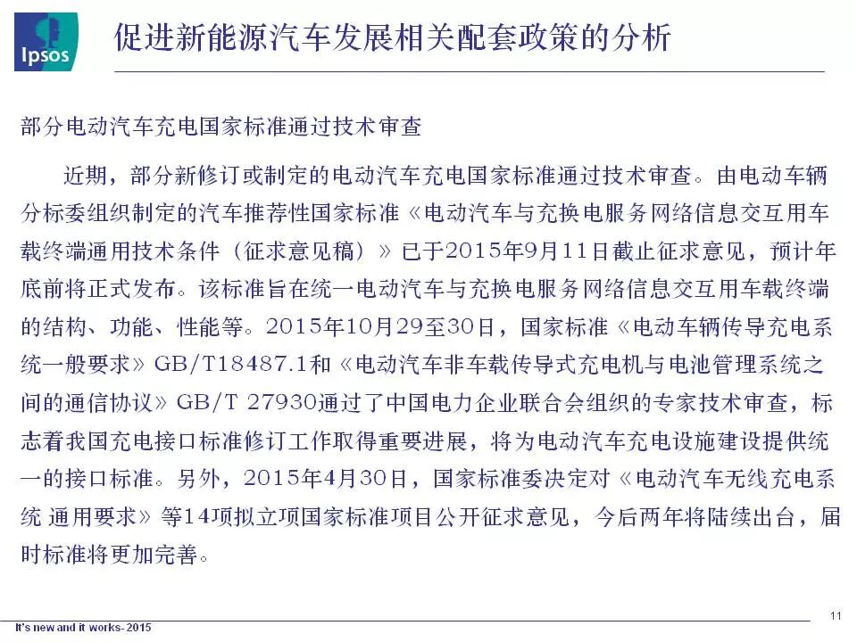 2015年3月24日,工信部发布《汽车动力蓄电池行业规范条件》。2015年9月11日,国家发改委环资司和工信部节能司就《 电动汽车动力蓄电池回收利用技术政策(2015年版)(征求意见稿)》公开征求意见,拟于2016年1月1日起施行。2015年9月29日,国务院办公厅印发《关于加快电动汽车充电基础设施建设的指导意见》。同时,《电动车辆传导充电系统一般要求》等电动汽车充电接口及通讯协议新国标的修订已通过了专家审查。上述政策标准与新能源汽车企业密切相关。因此,有必要对新能源汽车相关配套政策进行分析。