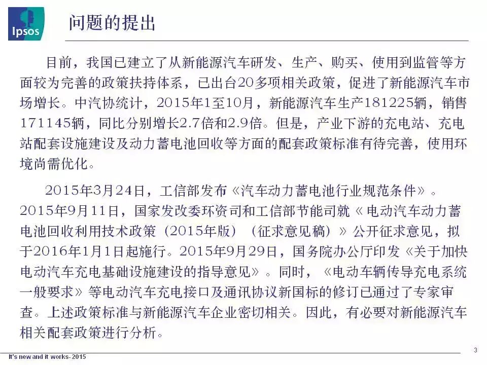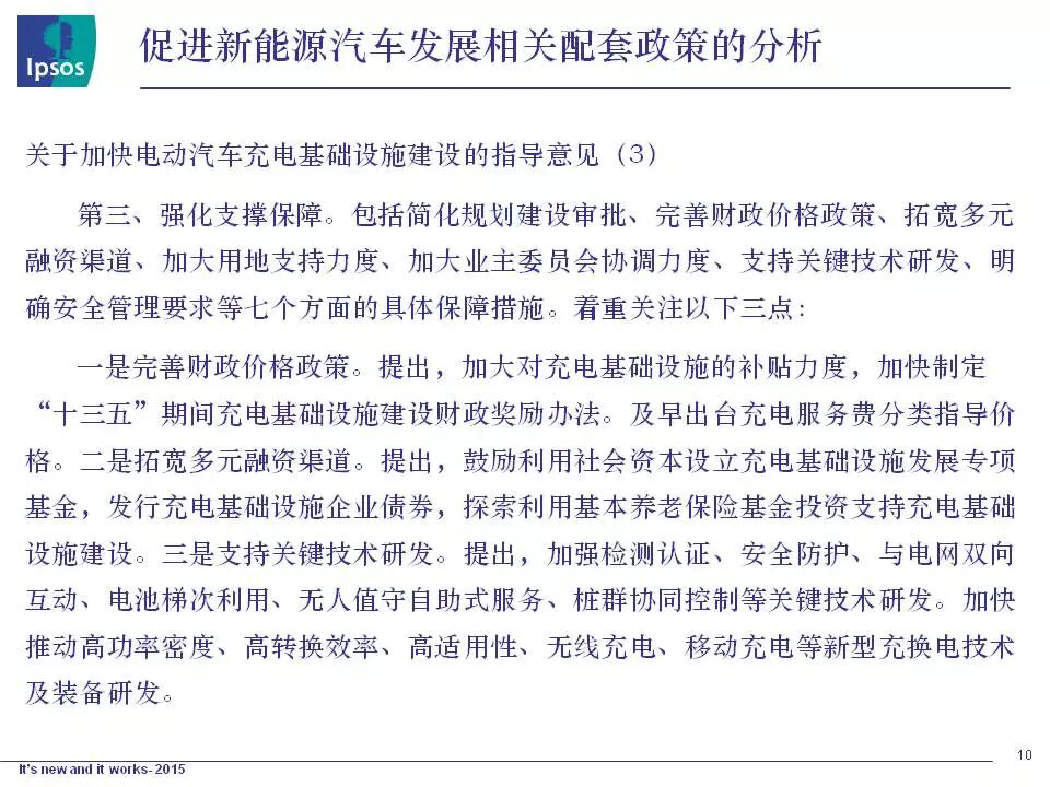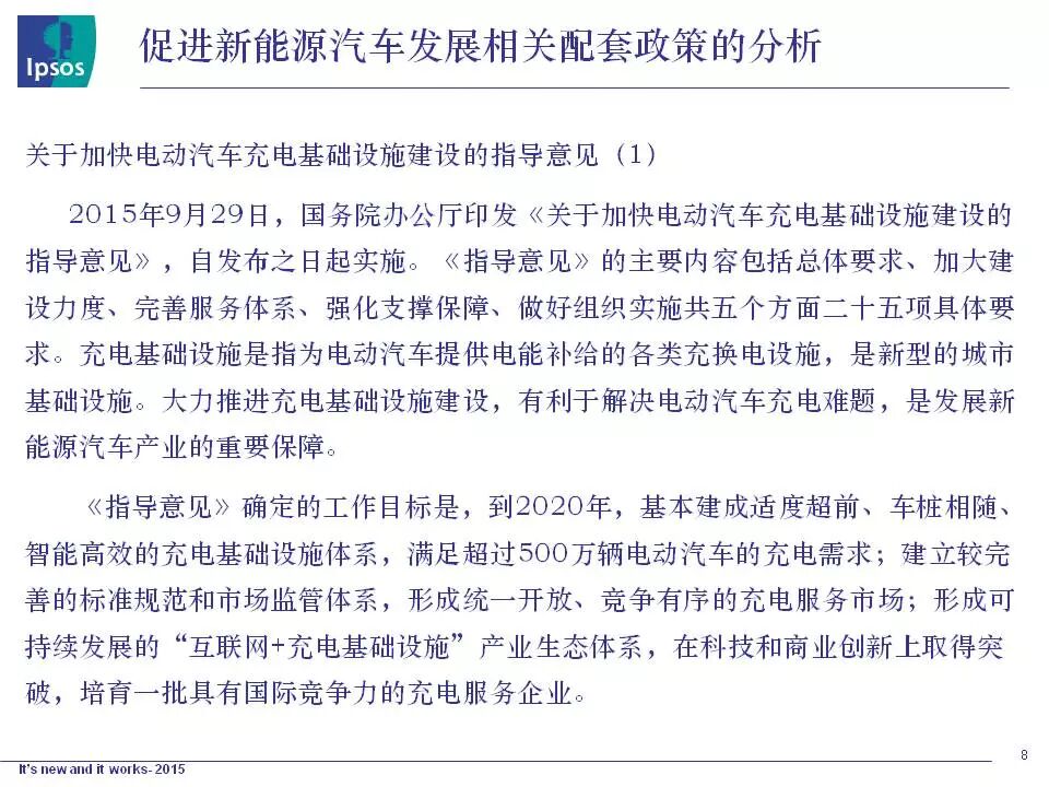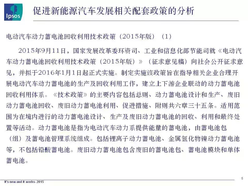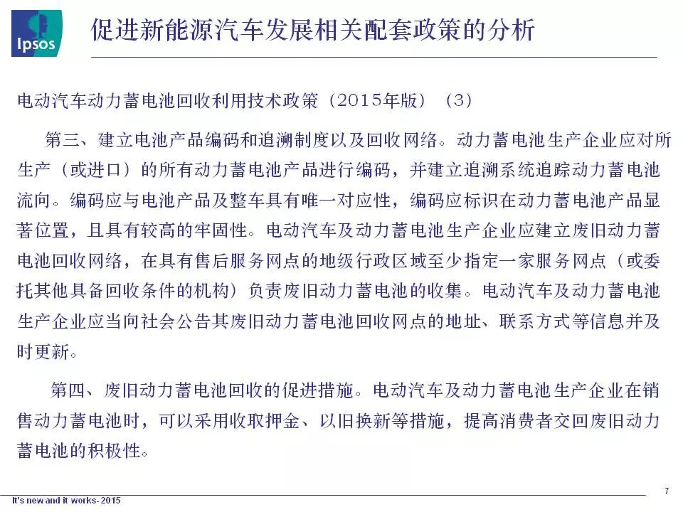 2015年3月24日,工信部发布《汽车动力蓄电池行业规范条件》。2015年9月11日,国家发改委环资司和工信部节能司就《 电动汽车动力蓄电池回收利用技术政策(2015年版)(征求意见稿)》公开征求意见,拟于2016年1月1日起施行。2015年9月29日,国务院办公厅印发《关于加快电动汽车充电基础设施建设的指导意见》。同时,《电动车辆传导充电系统一般要求》等电动汽车充电接口及通讯协议新国标的修订已通过了专家审查。上述政策标准与新能源汽车企业密切相关。因此,有必要对新能源汽车相关配套政策进行分析。