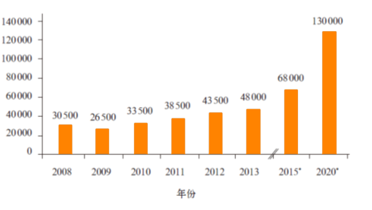 图1 2008-2020 年全球CF 的市场需求演革与未来预测