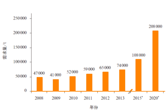 图2 2008-2020 年全球CF 的市场需求量及未来预测