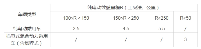 1、纯电动乘用车100km≤R<150km每车2.5万、150km≤R<250km每车4.5万、R≥250km每车5.5万元。
