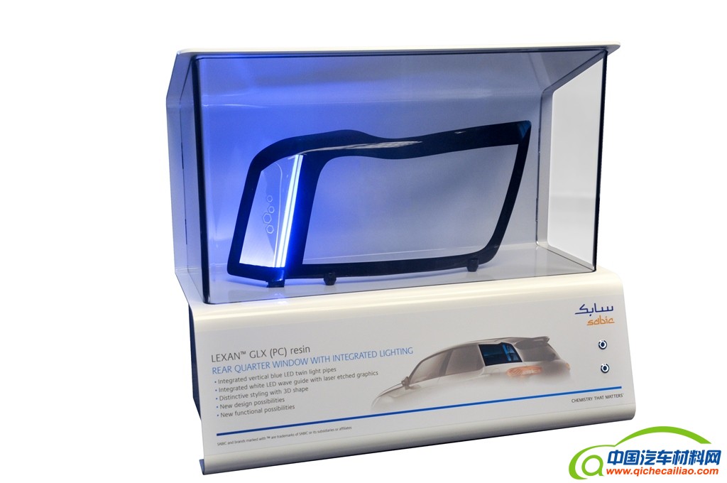 在 9 月 28 日到 30 日于德国达姆施塔特举办的国际汽车照明研讨会 (ISAL) 上,SABIC 首次披露了它研发包含集成照明功能的聚碳酸酯 (PC) 车窗的工作。 SABIC 在会上展示了用 LEXAN™和 CYCOLOY™树脂双注塑成型的后三角窗。此车窗有两组装饰照明组件:两支蓝色 LED 光管和一个白色 LED 导光条(带有白色的激光蚀刻图形)。