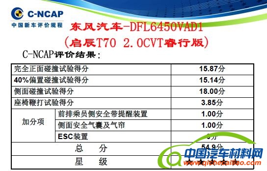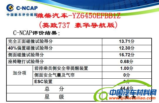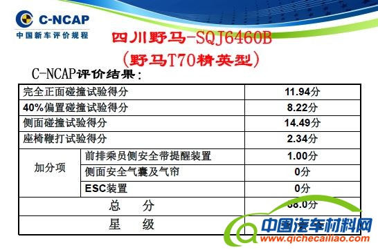 本批的9款试验车型均按较大销量的配置选取,每台车辆按照《C-NCAP管理规则(2015年版)》依次进行购买、试验及评价。本次实验中的所有车型都配备了前排安全气囊、带有预张紧器和限位器的前排安全带等基础安全设备,此外所有车型均获得了一定的加分。获得三星评价的川汽野马T70与潍柴英致737车型,分别在正面40%碰撞与鞭打试验中损失了较多分数,导致最终得分相对不高。