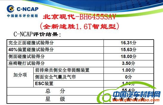 C-NCAP最终分数评价中,最高得分为61分。其中,上述的前三项试验每项试验满分为18分,三项试验总得分满分为54分;鞭打试验满分为4分。对前排乘员侧安全带提醒装置、侧气帘(及侧气囊)、电子稳定控制系统(ESC)分别有1分的加分。将以上三项碰撞试验和鞭打试验的得分及加分项得分之和(四舍五入至小数点后一位)记为总分,并评价星级。