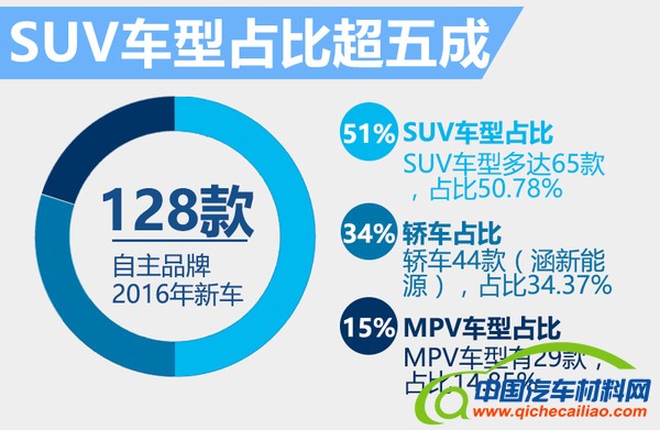 在过去的2015年,多个自主品牌推出了数十款全新车型,2016年作为一个全新规划的开端新产品的发布也将持续。网通社对自主品牌2016年将上市的新车进行了梳理汇总,发现有36个品牌在内的共计128款新车都处于在筹备上市阶段,其中时下最为流行的SUV车型占比超过了五成。