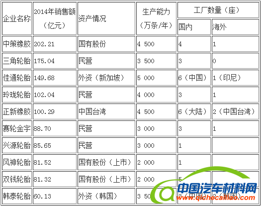 以2014年轮胎销售额排名,全国已形成年营业额在60亿元以上的10大轮胎企业集团。10大轮胎企业中,民营为4家、外资为3家、国有为3家。
