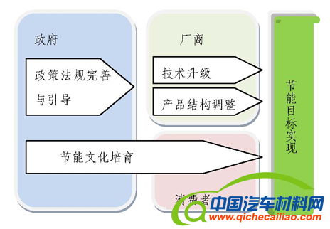关于节能汽车,它需要政府、行业、企业、公众和媒体的共同参与,需要全社会的共同努力。政府是节能目标实现的引导者和推动者,厂商和消费者是节能目标实现的执行者。因此,政府需要制定完善的政策法规,引导行业节能发展,同时着力培育汽车节能文化,促进消费环节的节能;厂商在政策的要求和引导下,考虑节能技术的经济性,从技术升级和产品结构调整两方面实现汽车的节能。