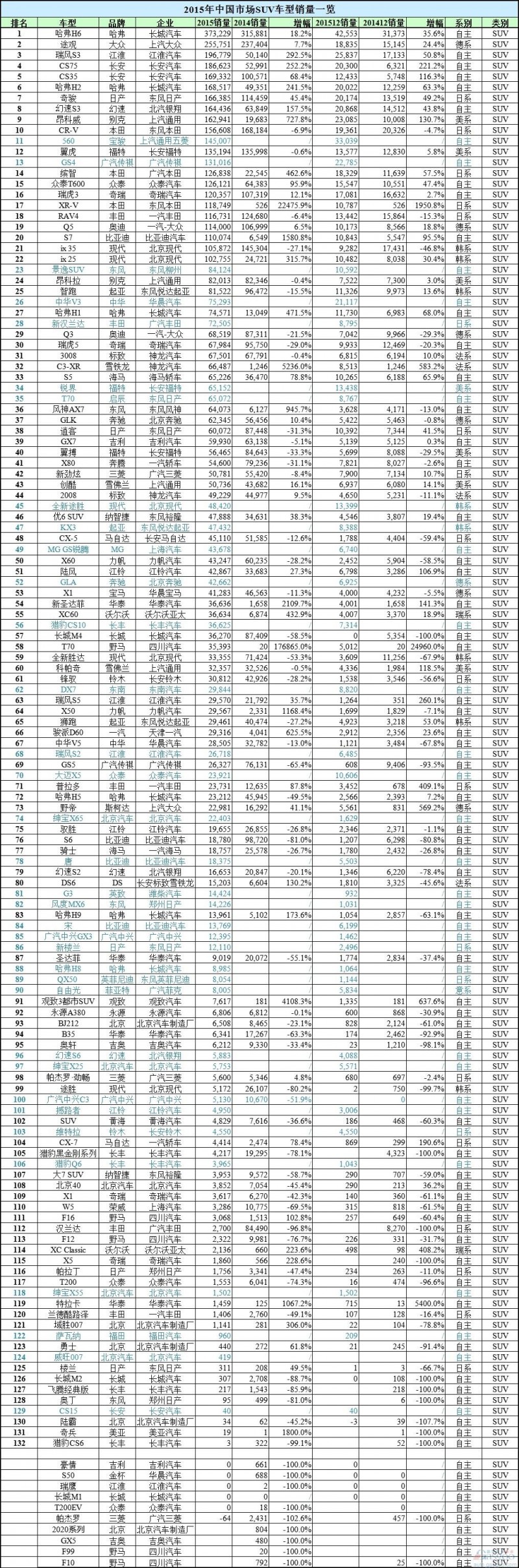 宝骏560和传祺GS4作为2015年SUV市场的“黑马”,其虽然上市不足一年,但是其市场表现值得肯定,2015年销量分别实现145,007辆和131,016辆,排名第11和13位。
