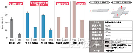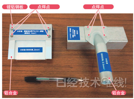 | 图1:铝合金与镀铝钢板的点焊示例 新钢板可以使用通常的钢板点焊机,与铝合金进行焊接。因为钢板越厚,焊接电流越低,便于使用通常的点焊机。 |
