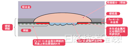 日新制钢与神户制钢所开发出了能够使用通常的钢板点焊机,与铝(Al)合金牢固焊接的熔融镀铝钢板(图1)。通常情况下,使用钢板点焊机焊接钢板和铝合金,在焊接面上会生成硬而脆的金属间化合物,焊接强度较低。新开发的钢板可以减少这种化合物。