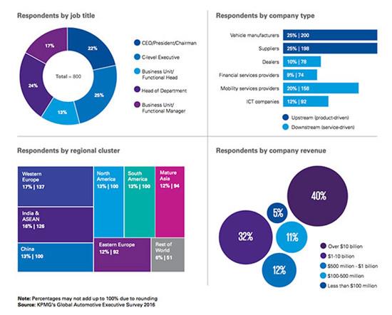 在这次的报告中,KPMG采访了800位来自世界38个国家的汽车行业领先公司,包括车企、供应商、经销商、金融服务供应商、汽车租赁公司、移动服务供应商以及首次加入的信息通信技术公司的高管们,数量是2015年的4倍。而且其中大约50%为C-level执行官或CEO、总裁。这些公司中72%的年收入都超过了10亿美元,甚至其中的40%已经超过了100亿美元。