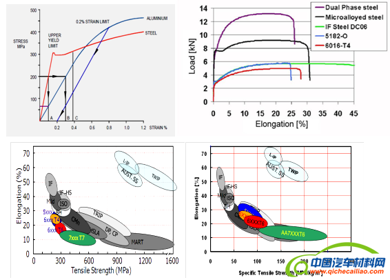 部分汽车用钢、铝的性能对比分析如图1所示。在相同的应力下,铝合金比钢具有更大的应变。在相同的碰撞过程中,可以吸收更大的能量。与无间隙原子IF钢相比,5182与6016铝合金的强度与之相当,而塑性较低。由强度-延伸率图可以看出,5000/6000系列的车用铝合金强度与IF/BH钢相当,而延伸率与DP/TRIP钢相当。但值得一提的是,具备如此性能的同时,其重量却减轻很多。所以提出一个“比强度”的概念,即强度/重量,作为衡量指标。以比强度来衡量,铝合金便与高强度DP/TRIP钢相当。