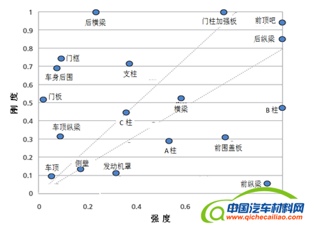 汽车车身各部件,根据部位和作用的不同,对强度和刚度提出了不同的需求,如图2所示。B柱,对强度的要求高于刚度,故在材料的选用中应倾向于强度的保证;而门板,对刚度的要求高于强度,故应选刚度良好的原材料。