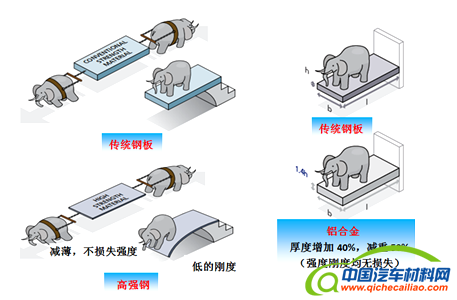 前已述及,汽车用钢的强度是不断提高的,而刚度却没有明显的改变。对强度、刚度的示意图如图3所示,高强钢替换传统钢板后,通过减薄,在保证强度不降低的前提下,实现轻量化。但厚度减薄的同时,截面刚度也大大降低,使用过程中保证不了刚度;铝合金替换传统钢板后,通过增加40%的厚度,同时保证强度、刚度不损失,却可以实现减重50%。但由于铝合金部件厚度的增加,对部件包装、运输和应用部位等都有一定的局限性。