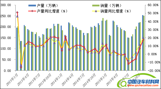 为刺激已连续4个月产销负增长的车市需求,9月29日,国务院召开常务会议提出,从2015年10月1日到2016年12月31日,对购买1.6升及以下排量乘用车实施减半征收车辆购置税的优惠政策。9月汽车产销量同比五连降的势头结束,产量同比降幅趋缓,销量呈小幅增长,但“金九”成色明显不足。而优惠政策的效果立竿见影。10月份车市开始快速复苏,产销均呈现明显回升,分别完成218.87万辆和222.16万辆,其中1.6升及以下排量的一些车型受到热捧。优惠政策效果在11月份得到延续,加上上年同期基数偏低,汽车销售增速继续回暖,11月国内汽车产销量双双超过250万辆,均创历史新高,比上月及上年同期均出现大幅度增长,市场“U”型反弹愈加明显(见图3)。