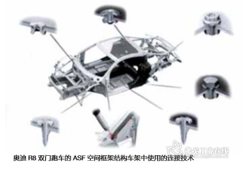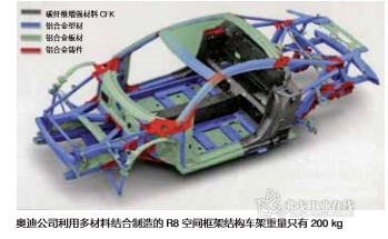 借助于多材料结构方案使得新型奥迪R8轿车的空间框架结构车架只有200kg,强度提高了40%,但重量却比原来减轻了15%。这一ASF空间框架结构车架79%的材料是铝合金,13%的材料是CFK碳纤维增强材料。