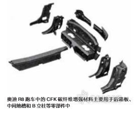 根据使用部位的不同,CFK碳纤维增强材料零部件的结构也有所不同:后箱板的横杆承受的横向载荷最大,因此它所使用的碳纤维织物纤维层的纤维方 向主要都是朝向一个方向的,它们中只有14%的是相互重叠的,5mm厚的碳纤维增强材料层却有着很高的抗拉强度,高达3950MPa。B立柱的碳纤维增强 层则相反,它的纤维层有着相互交叉的朝向,以便能够承受来自横向和纵向的载荷,它的抗拉强度达到了900Mpa。奥迪R8 V10 plus型轿车车门正后方的侧翼和车尾扩散器也是用CFK碳纤维增强材料制造的。
