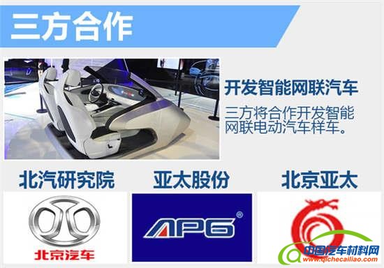 据官方公告显示,北京汽车研究总院有限公司已与亚太股份(浙江亚太机电股份有限公司)以及北京亚太汽车底盘系统有限公司签订了《智能网联汽车合作开发战略协议》。根据协议,为适应新能源汽车、智能网联汽车行业发展,三方合作开发智能网联电动汽车样车。