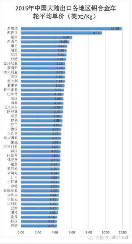 以下是2015年中国大陆出口各地区铝合金车轮产品的年均单价排名: