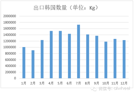 而韩国进口价格则是大部分时间一直处于低位,上下波动较大,且走势怪异,与中国大陆铝合金车轮出口价格的总体走势毫无关联。