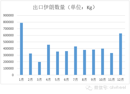 2015年1至12月份伊朗从中国进口铝合金车轮重量