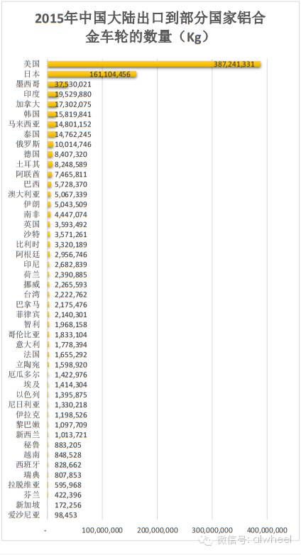 以下是2015年部分进口中国大陆铝合金车轮产品的国家和地区的进口重量(单位:Kg)数据图表: