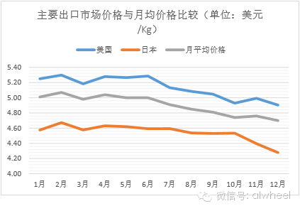 如果换个角度观察,以月为时间单位进行统计,我们发现2015年中国大陆铝合金车轮的月平均出口价格总体呈下降趋势,这主要是受美国、日本两个主要市场价格走势的影响。