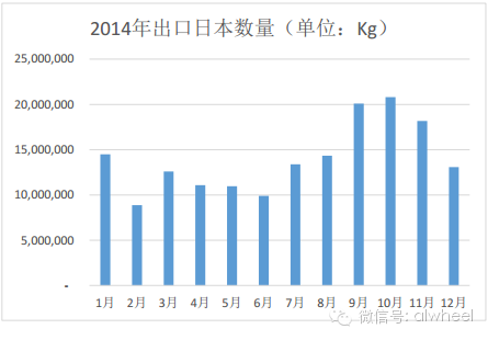 下面是2015年和2014年日本每月从中国大陆进口铝合金车轮数量的示意图,我们可以清楚的看到其中的规律: