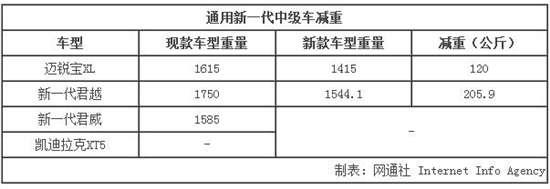 新一代迈锐宝、君越以及凯迪拉克XT5已在车展中正式展出,年内将投放市场。新一代君威预计2017年上市。全新一代迈锐宝入华后称为“迈锐宝XL”,整车重量为1415公斤,相比前一代车型减重120公斤。全新一代君越轻量化技术更高,整车减重205.9公斤,新车将在一季度正式上市。XT5和新一代君威的具体参数还未公布,不过凯迪拉克XT5已经进入国家工信部目录,整车整备质量最低1795公斤。