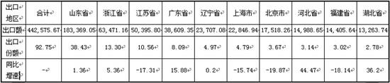 2015年,制动系零部件出口额前10个地区为:山东省、浙江省、江苏省、广东省、辽宁省、上海市、北京市、河北省、福建省和湖北省,上述10个地区的出口额为44.26亿美元,占制动系零部件出口额的92.75%。其中,山东省出口的主要产品为:其他车辆用制动器及其零件、制动摩擦片、车辆总重≥14t柴油货车及车辆总重≥8t汽油货车用制动器及其零件,出口额分别为124,828.01万美元、36,334.96万美元、13,577.54万美元。