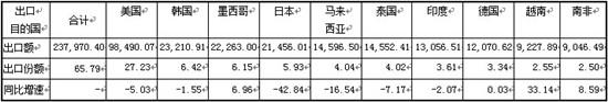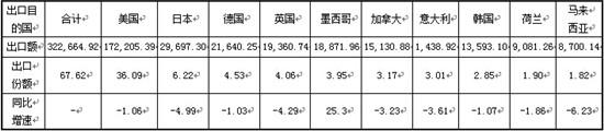 2015年,传动系零部件出口额前10位目的国为:美国、韩国、墨西哥、日本、马来西亚、泰国、印度、德国、越南和南非,向上述10个国家的出口额为23.80亿美元,占传动系零部件出口额的65.79%。其中,向美国出口的主要产品为:小轿车用自动换挡变速器(AT)、未列名机动车用变速器、车辆用传动轴,出口额分别为68,694.40万美元、62,518.50万美元、41,033.38万美元。