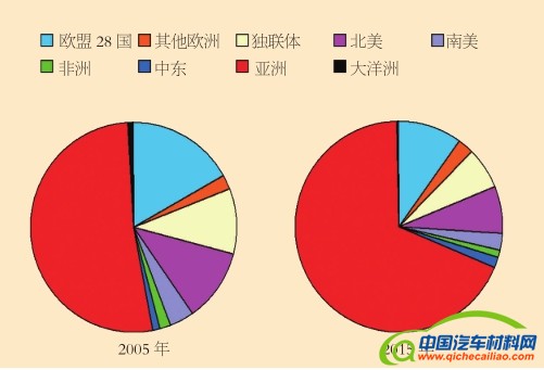 图3 2005年和2015年全球主要产钢地区粗钢产量占比