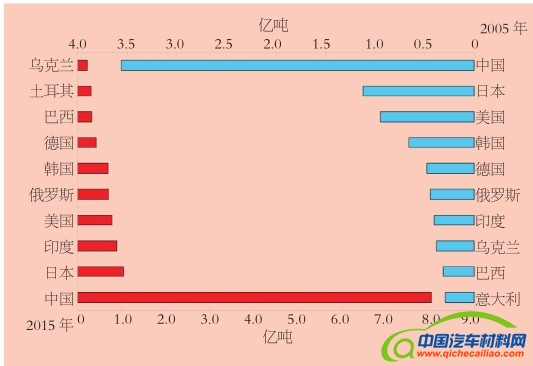 2015年全球前十大粗钢生产国依次为中国(8.0亿吨)、日本(1.1亿吨)、印度(8960万吨)、美国(7890万吨)、俄罗斯(7110万吨)、韩国(6970万吨)、德国(4270万吨)、巴西(3320万吨)、土耳其(3150万吨)和乌克兰(2290万吨)。其中,印度粗钢产量首次超越美国,成为全球排名第三粗钢生产国,这主要是由于印度政府推动该国钢铁企业增加钢铁产能。与2005年全球前十大粗钢生产国排序相比,排名第一和第二的依然为中国、日本,印度排名由第七上升至第三,受此影响原本排名第三至第六的美国、俄罗斯、韩国和德国依次下降一位,乌克兰由第八降至第十,巴西排名由第九上升至第八,原本排名第十的意大利被土耳其挤出前十名。