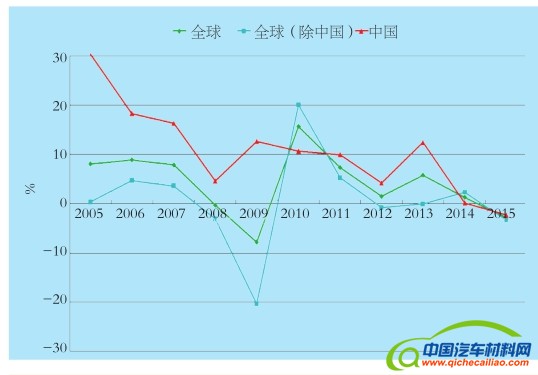 图2 2005-2015年全球、全球(除中国)及中国粗钢产量变化率