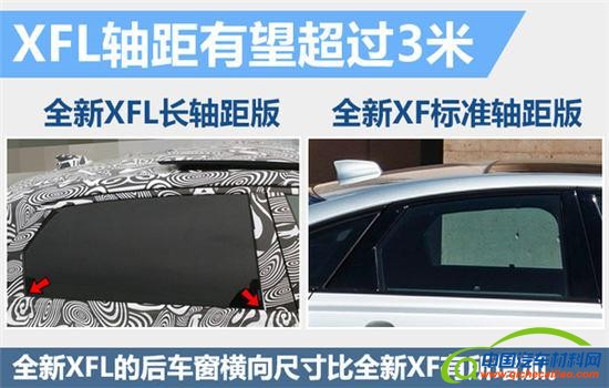 全新XFL在外观方面延续了全新XF的整体设计风格,蜂窝状进气格栅、“J”型前LED日行灯以及横向交叉双圆盘式的LED 刹车尾灯均得以保留。相比目前在售的进口全新XF,新车的最大变化为后车窗的横向尺寸有所增加,这是在原车型基础上加长轴距后最明显的特征。全新XF较上一代车型在轴距上增加了51毫米,达到2,960毫米;国产的全新XFL将轴距进一步加长后,有望突破3,000毫米。
