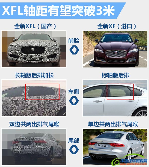 新车相比目前在售的进口XF最大的变化就是,XFL后车窗横向尺寸有所增加,这也是国产长轴距版最明显的特征。全新XF较上一代车型在轴距上增加了51毫米,达到2,960毫米,而国产的XFL轴距将进一步加长,有望突破3,000毫米。