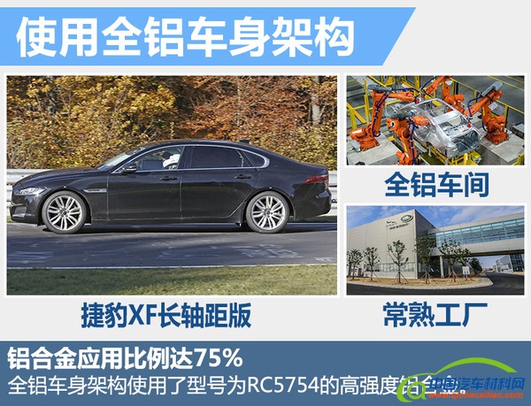 奇瑞捷豹路虎全铝车身车间占地面积48,384平方米,拥有335台机器人,其中自冲铆接机器人232套,自动化率达100%。根据官方公布的信息,全新捷豹XF长轴距版的车身铝合金应用比率达75%,使用了型号为为RC5754的高强度铝合金,相比传统车身材料,捷豹全铝车身在强度、耐腐蚀性、连接性及成型性等方面更具优势,同时重量也将大幅降低。全新捷豹XF长轴距版车身重量仅为297千克,有利于提升燃油经济性和操控表现。