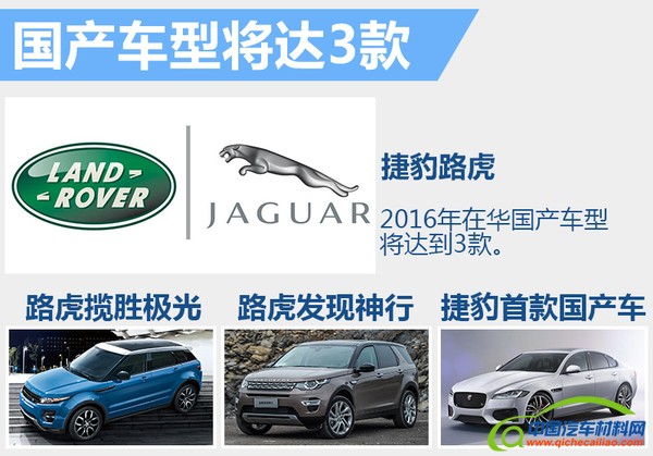 捷豹路虎率先将路虎品牌旗下的揽胜极光和发现神行,进行了在华本土化生产。官方提供的数据显示,在路虎品牌2016年前2月的销量中,国产车型已占据近一半份额,在华业务模式由销售以进口为主向进口与国产双线并行的过渡正在加快。第一款国产的捷豹车型在今年正式投入市场,将使得国产车占比进一步提升,对于今年捷豹路虎在华整体表现起到重要作用。