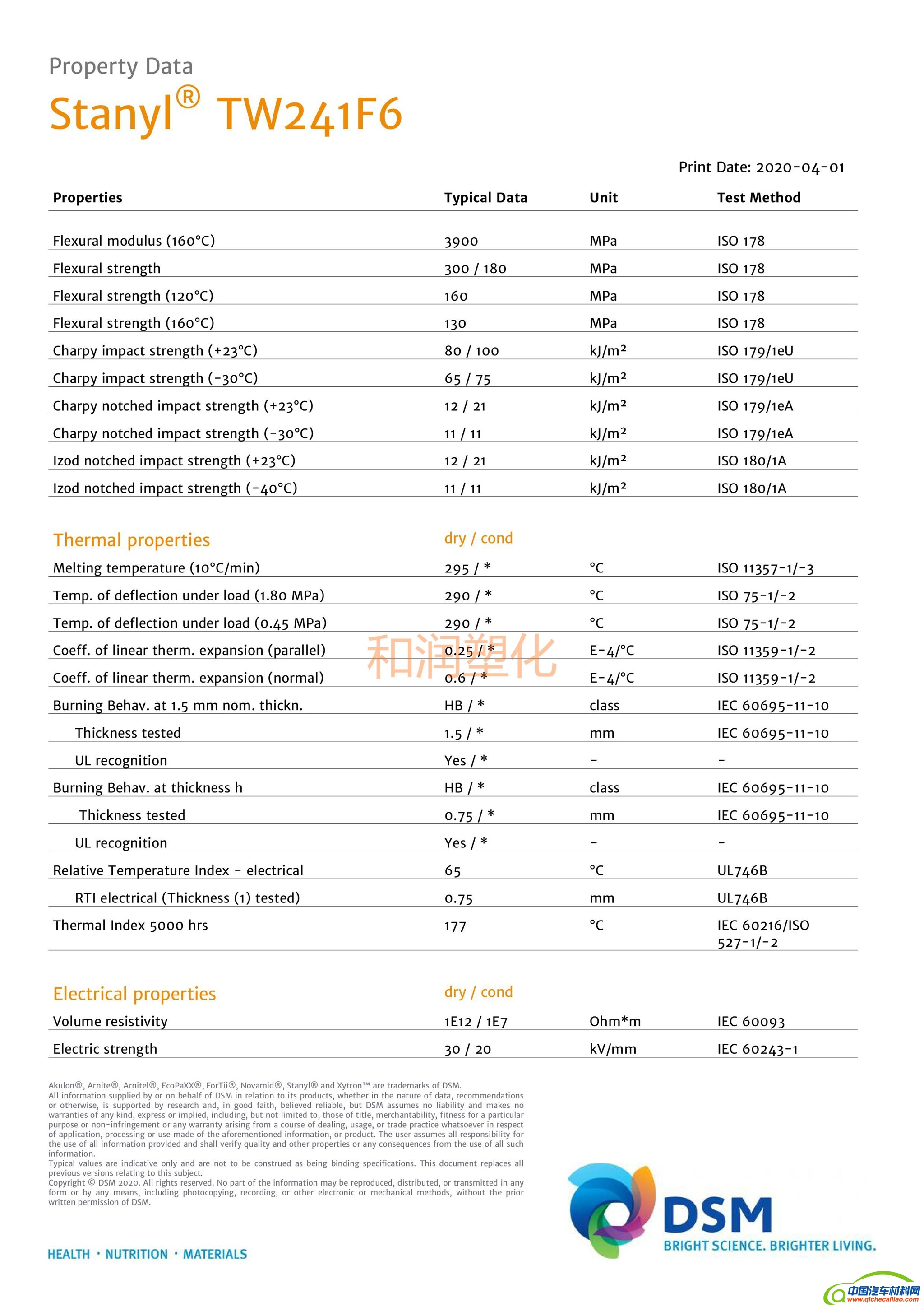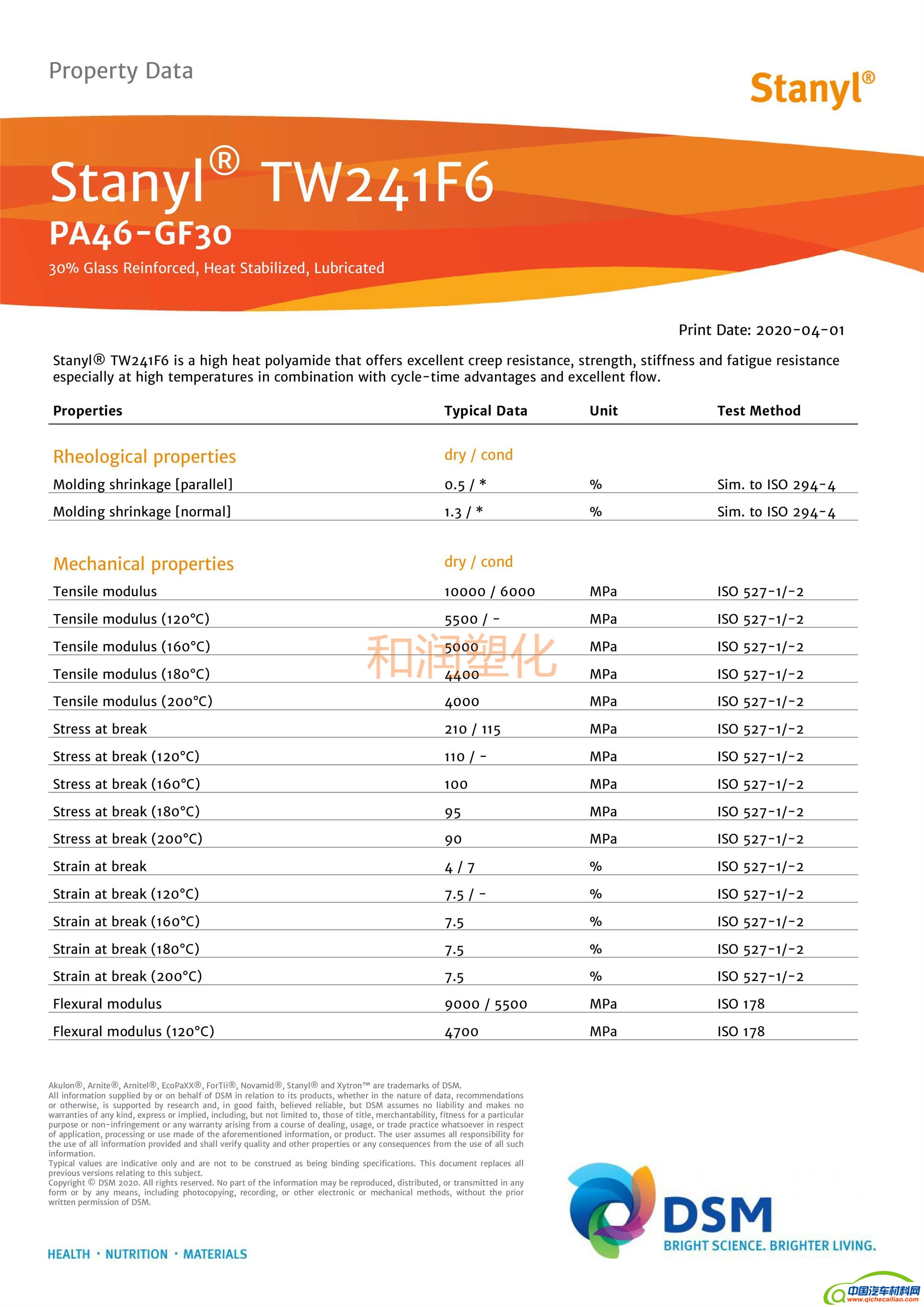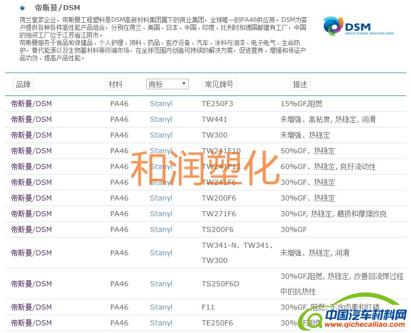和润塑化(深圳)有限公司 供应PA46塑胶原料: PA46荷兰DSM HF5040 PA46日本DSM TW271B3 PA46荷兰DSM TW271F6 PA46荷兰DSM TW200F6 PA46荷兰DSM TE248F6 PA46荷兰DSM TE200F6 PA46荷兰DSM LED1371 PA46荷兰DSM TW341 纯树脂 PA46荷兰DSM TS250F4D PA46荷兰DSM TE250F3,TE250F6 玻纤增强阻燃 PA46荷兰DSM TE250F8,TE250F9 玻纤增强防火V0 PA46荷兰DSM 46HF5050,46HF4130,46HF4530 玻纤增强 PA46荷兰DSM TW241F3,TW241F6 玻纤增强 PA46荷兰DSM TW241F8,TW241F10,TW241F12 玻纤增强 PA46荷兰DSM TS200F6,TS256F6 防火V0 PA46荷兰DSM TC153,TC154 TC551 导热阻燃级 PA46荷兰DSM TW271B3,TW271B6 碳纤维增强导电 PA46特性: PA46(聚己二酰丁二胺)是一种具有高熔点和高结晶度的新型聚酰胺树脂。 PA46熔点高(295℃),热变形温度也高,而长期使用温度(CUT 5000hours)可达163℃。 这些特性使Stanyl PA46比其它工程塑料如PA6、PA66、PPA和聚酯在耐热、高温下的机械强度、 耐磨等方面具有技术优势,并且成型周期短,加工更经济。 优点 1:具有易加工性和卓越的流动性能。 2:具有卓越的抗拉强度、良好的绝热性能。 3:阻燃、可电镀、经热稳处理的、耐热的。 4:高刚度保持性能,同时表现出良好的高温抗蠕变性。 电气及电子应用: SMD元件,接插件,断路器,绕线元件,电动马达部件和电器元件; 机载部件应用:齿轮、轴承和轴承罩汽车应用:传感器和连接器